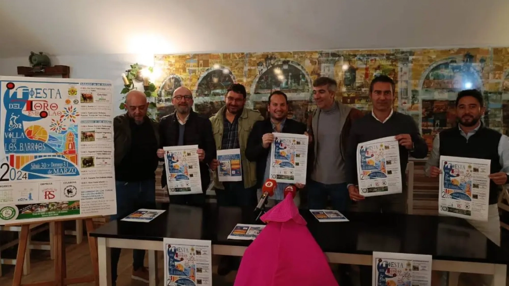 El concejal de Festejos, Daniel Pérez Cumbre;  el concejal de Turismo, Pablo García; el presidente de la Peña Toro Embolao, Joaquín Gil; el empresario de Ruedos del Sur, Jesús Santana; han presentado esta tarde en la sede de la entidad, situada en la plaza de toros, el cartel y toda la programación de la Fiesta del Toro Embolao 2024, que se celebrará el sábado 30 y domingo 31 de marzo.