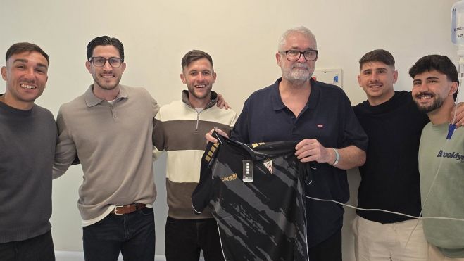 El capitán del equipo, Iván Turrillo, hizo entrega, en nombre de la entidad albirroja, de varias camisetas a pacientes ingresados, aprovechando los jugadores y representantes del equipo técnico para charlar distendidamente y hacerles más llevadera su estancia en el centro hospitalario.
