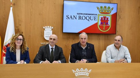 El alcalde de San Roque, Juan Carlos Ruiz Boix, y el responsable de la Fundación Moeve en Andalucía, Jesús Velasco, han suscrito un convenio de colaboración por el que esta institución financiará una serie de mejoras en la Estación Ambiental Madrevieja, que se ejecutarán desde el Ayuntamiento. A la firma han asistido también el teniente de alcalde de Medio Ambiente, Juan Serván, y la portavoz de Fundación Moeve en la comarca, Estrella Blanco.