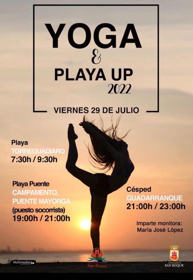 La actividad “Yoga y Playa UP 2022” se desarrollará por tanto el viernes 29 de julio en tres sesiones. La primera tendrá lugar en Torreguadiaro, en horario de 7.30 a 9.30 horas, y permitirá disfrutar del amanecer. La segunda se desarrollará a la altura del puesto de socorristas de la playa de Puente Mayorga, entre las 19.00 y las 21.00 horas, y la última en el césped del litoral de Guadarranque, de 21.00 a 23.00 horas.