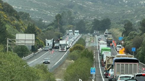 Las labores de retirada de un camión accidentado cargado de tomate, junto a trabajos de asfaltado, están provocando importantes retenciones en la A-7 a la altura de La Alcaidesa, en el término municipal de San Roque.