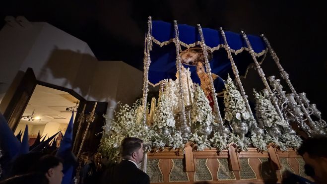 Detrás llegó Nuestra Señora del Buen Fin que tuvo en su barrio un recibimiento grandioso, con sentidas saetas y una lluvia de pétalos. Se recreó en los metros finales con los sones de la Sociedad Filarmónica Virgen de las Angustias de Sanlúcar la Mayor, y emocionó. Dos jovenes cofrades se abrazaban delante del paso de palio a lágrimas vivas.