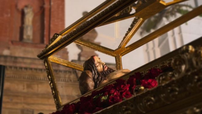 Los pasos del Santo Entierro y de María Santísima de la Soledad dejan un misterio: es riguroso luto y, a la vez, desprende una elegante luminosidad. Deslumbra la urna dorada y el rostro del Cristo Yacente, y también arroja luz el paso de la Virgen, con un sublime palio que guarda en su techo un impresionante relieve de la patrona de la ciudad, la Virgen de la Palma.