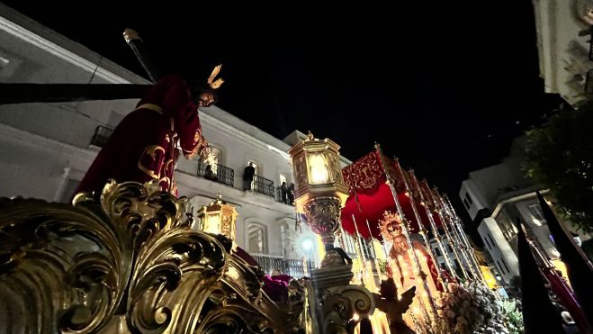 El Nazareno vira en un movimiento casi marinero y avanza en su procesionar solemne por las calles tarifeñas, seguido de la Paz. A Él lo acompaña la Agrupación Musical Santiago y Santa Ana, de Algodonales; a Ella, la Asociación