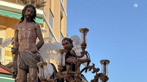 Flagelación cambia por completo el rostro al Domingo de Ramos de La Línea. El alegre fervor que dejaba a su paso la Borriquita se torna en dolor. Están flagelando a Jesús. El paso de misterio impone e invita a la reflexión.