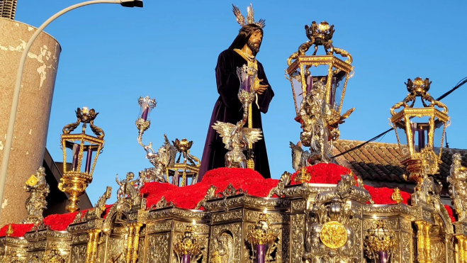 A las 19:45 horas, se abrieron las puertas del templo y la emoción se desbordó entre los presentes. La salida de Nuestro Padre Jesús Cautivo y Rescatado, conocido popularmente como Medinaceli, junto a María Santísima de la Trinidad, provocó una reacción unánime de aplausos y devoción. El respeto, la solemnidad y la intensidad del momento se hicieron palpables desde el primer instante.