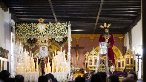 La cofradía hizo de tripas corazón y se movió para preparar la parroquia y que los titulares, listos para lucir por las calles, recibiera en el templo a los fieles, que seguían bajo la lluvia en un gesto de amor infinito. Las bandas, la Agrupación Musical Virgen del Buen Suceso de Los Corrales-Sevilla y la Banda de Música Maestro Infante de Los Barrios, tocaron ante los pasos alineados, uno al lado de otro, Madre e Hijo, Esperanza y Medinaceli, y aumentaron la emoción, ya a flor de piel. Ríos de lágrimas mientras que la lluvia se veía cruzar por las farolas de la plazoleta dando la razón a la decisión de la cofradía. Los devotos aguantaban el chaparrón. "Tengo la chaqueta chorreando", decía una joven impasible tras la valla, a pocos metros de la puerta de la capilla. Con todo listo, fueron pasando hombres, mujeres y niños por delante de los pasos del Señor y de la Virgen como mal menor.