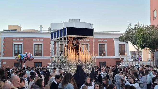 El cortejo avanzaba acompañado únicamente por el firme compás de los costaleros y una tenue música que marcaba el caminar del Cristo y de la Virgen. Un ambiente íntimo, casi suspendido en el tiempo, donde cada paso resonaba con fuerza en el corazón de los presentes.