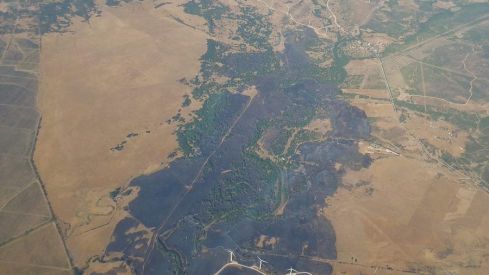 Desde el Consorcio informan que el incendio avanza en dirección oeste, en sentido del viento de Levante, y hay tres helicópteros de enfoca, recogiendo agua de la presa de Almodóvar.