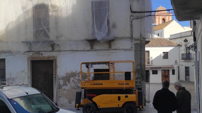 La empresa Protecciones Itálica SL, bajo encargo municipal, deja listos hoy los trabajos preventivos consistentes en la incorporación de una malla protectora por toda la fachada de este edificio, en sus dos caras. Una que asoma a la calle de la Fuente y la otra que está justo en la plaza Hermanos Costaleros.