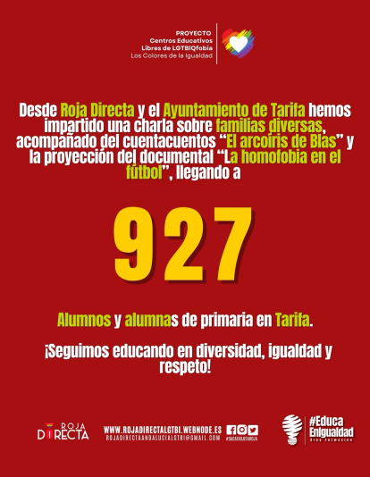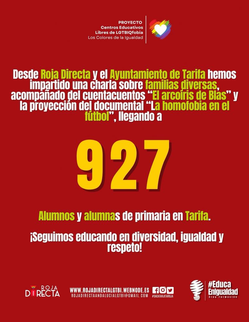 Un total de 927 niños y niñas de los centros educativos tarifeños han participado en las distintas sesiones, que han incluido el cuentacuentos “El arcoíris de Blas”, una charla sobre familias diversas y la proyección del documental “La homofobia en el fútbol”. El objetivo ha sido acercar la realidad de las distintas formas de familia y fomentar valores de convivencia y empatía desde las edades más tempranas. “La diversidad debe vivirse con naturalidad desde la infancia. Educar en igualdad es la base para construir una sociedad libre de prejuicios y discriminación”, ha señalado el equipo de Roja Directa LGTBI.