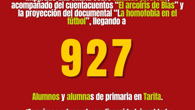 Un total de 927 niños y niñas de los centros educativos tarifeños han participado en las distintas sesiones, que han incluido el cuentacuentos “El arcoíris de Blas”, una charla sobre familias diversas y la proyección del documental “La homofobia en el fútbol”. El objetivo ha sido acercar la realidad de las distintas formas de familia y fomentar valores de convivencia y empatía desde las edades más tempranas. “La diversidad debe vivirse con naturalidad desde la infancia. Educar en igualdad es la base para construir una sociedad libre de prejuicios y discriminación”, ha señalado el equipo de Roja Directa LGTBI.