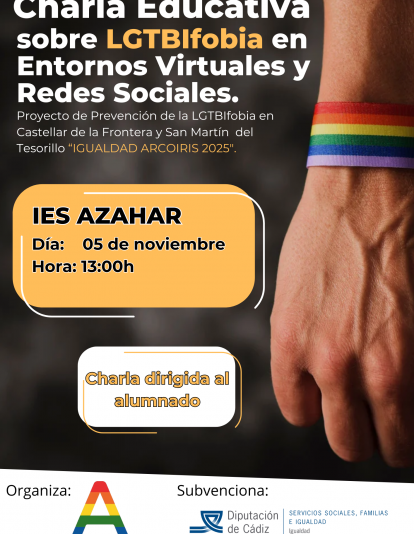 La asociación Arcoíris LGTBI Campo de Gibraltar continúa su labor educativa y de sensibilización en los centros educativos de la comarca, dentro del marco del Proyecto “Igualdad Arcoíris 2025”, con una nueva charla educativa sobre LGTBIfobia en entornos virtuales y redes sociales, que se celebrará el miércoles 5 de noviembre a las 13:00 horas en el IES Azahar de San Martín del Tesorillo.