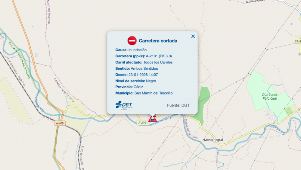 La Dirección General de Tráfico ha informado del corte de la carretera CA-513 -también conocida como A-2101-, que esta mañana ha amanecido con acumulación de agua por las lluvias registradas durante la madrugada del viernes 23 de enero.