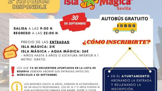 El Ayuntamiento de Tesorillo ha puesto en marcha una excursión a Isla Mágica el próximo 30 de septiembre y viendo la gran acogida que ha tenido ha decidido poner a disposición un segundo autobús.